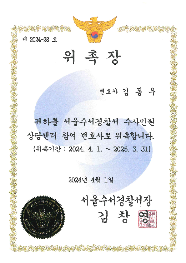 김동우 변호사는 2024년 4월 1일 서울수서경찰서(서장 김창영) 「수사민원상담센터 참여 변호사」로 위촉되었습니다.