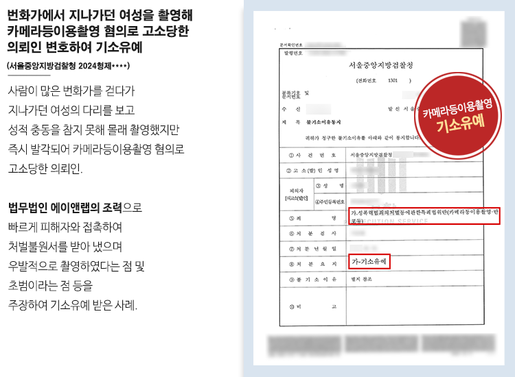 번화가에서 지나가던 여성을 촬영해 카메라등이용촬영 혐의로 고소당한 의뢰인 변호하여 기소유예