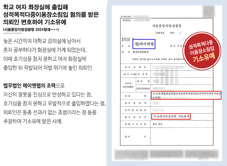학교 여자 화장실에 출입해 성적목적다중이용장소침입 혐의를 받은 의뢰인 변호하여 기소유예